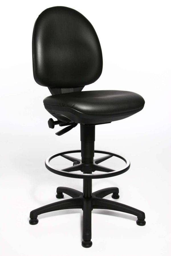 Topstar TEC 50. Degelijke baliestoel met Polypropyleen (Stofgroep G) of PVC (Stofgroep D) bekleed. Zithoogte verstelbaar van 59-84 cm. Rugleuning in hoogte verstelbaar èn voorzien van zogenaamd ‘permanentcontact-mechanisme’ (zie Keuzehulp voor verklaring van deze techniek). Onderstel kunststof zwart. Metalen voetenring in hoogte verstelbaar. Wordt standaard geleverd met universele glijdoppen. LGA getest: veilig, degelijk en betrouwbaar.