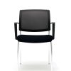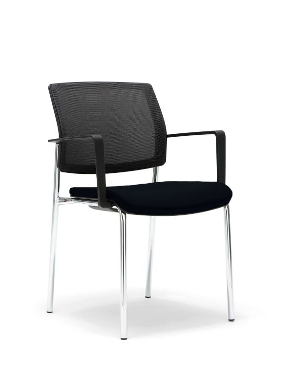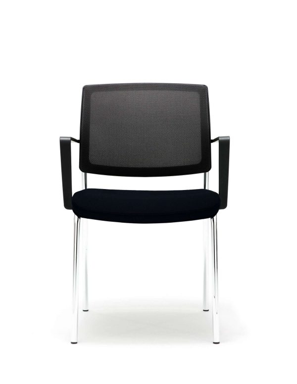 Gispen bezoekersstoel Zinn model B4 4-poots frame. Comfortabele Gispen bezoekersstoel op verchroomd 4-poots onderstel met glijders. Stapelbaar. Met stabiele kunststof armleggers. Ruimte tussen de armleggers 50 cm. Rugleuning bekleed met Netweave 100 zwart SZ (60999). Bekleding zitting: Camira Xtreme Plus S2N Havana YS009.