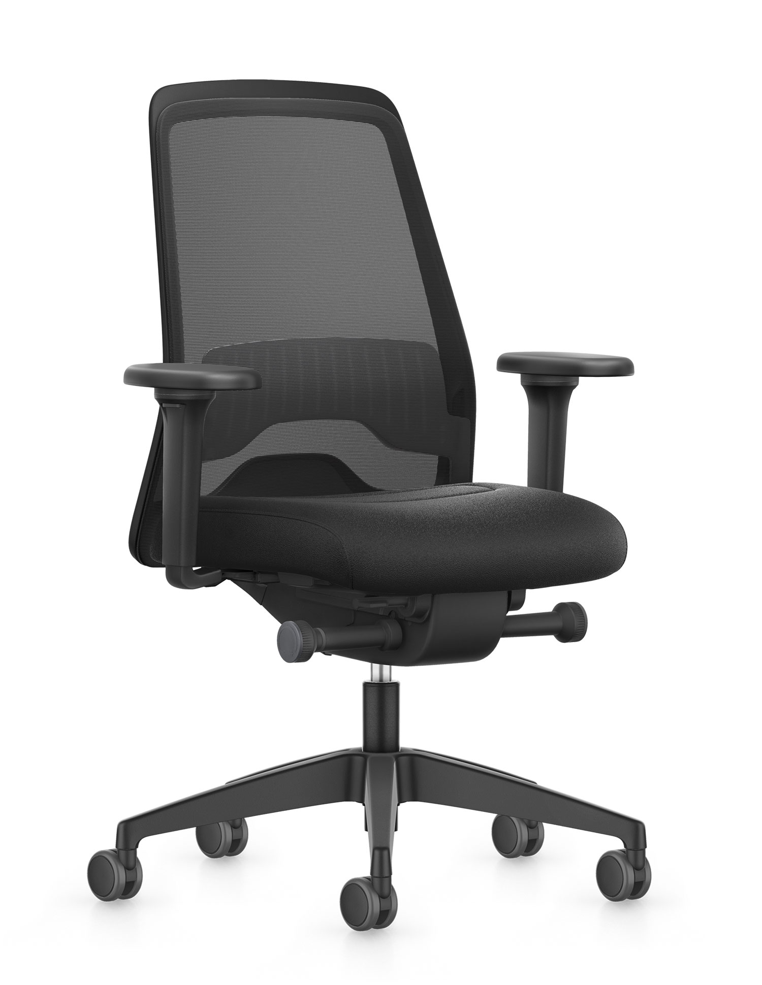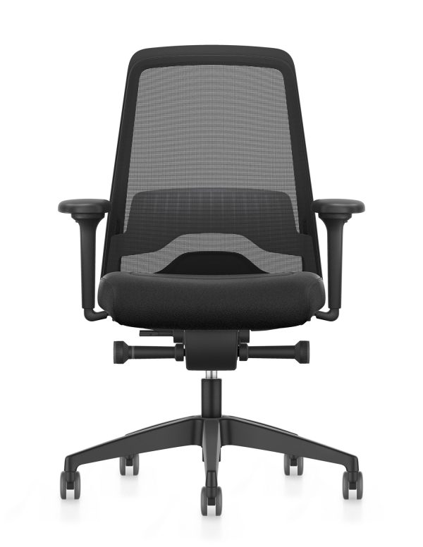 De netbespanning van de rugleuning biedt een goede combinatie van flexibiliteit en ondersteuning. De rug wordt natuurlijk gevolgd en blijft tegelijk goed geventileerd. Het vijfteens onderstel is gemaakt van sterk kunststof en kan worden geleverd met harde of zachte wielen, afhankelijk van de vloer.