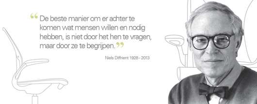 In zijn werkzame leven was Niels Diffrient een typisch exponent en aanhanger van het zogenaamde Modern Design, dat zich manifesteerde vanaf het midden van de afgelopen eeuw. Hij werkte samen met gelijkgestemde ontwerpers zoals Eero Saarinen, Charles Eames, Marco Zanusso en Henry Dreyfuss.