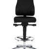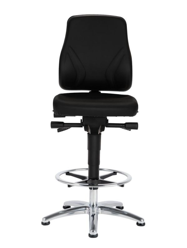 Se7en Comfort 9631 loketstoel kunstleer. Forse, comfortabele zitting en rugleuning bekleed met kunstleer, kleur zwart. Schuifzitting, voor gemak van langere gebruikers. Het synchroon-mechanisme combineert een beweging van de rugleuning met een daarop afgestemde beweging van de zitting. Verhoogde gasveer met in hoogte verstelbare voetenring. Stabiel aluminium gepolijst voetkruis staat standaard op kunststof glijders. Optioneel leverbaar met universele ‘zit-stop’ zwenkwielen (tegen meerprijs); deze voorkomen dat de stoel wegrolt tijdens gebruik.