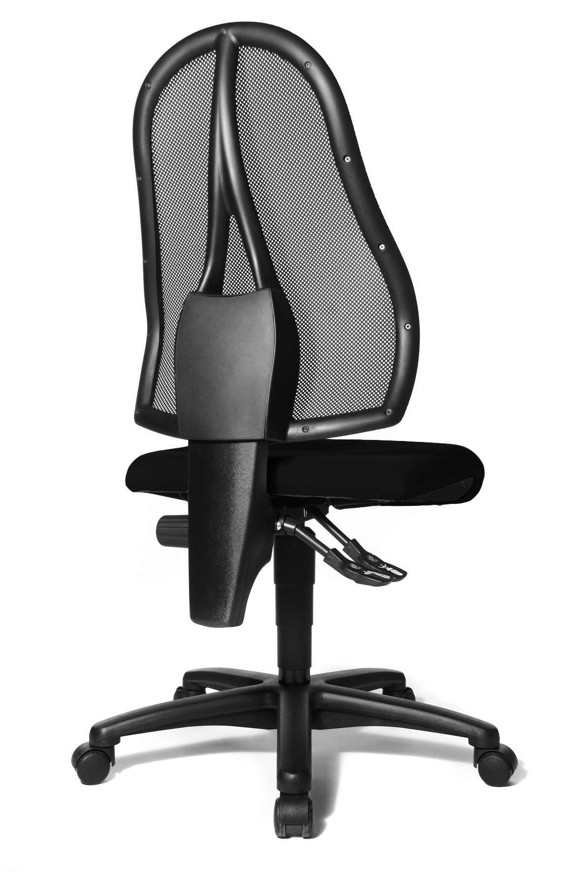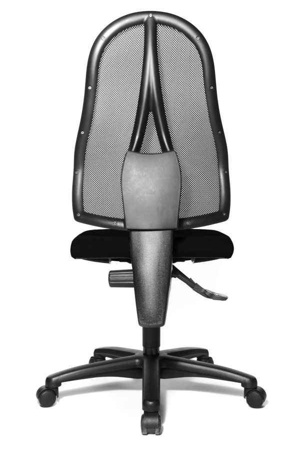 Topstar Open Point P. Moderne, trendy bureaustoel. In hoogte verstelbare rugleuning met ‘ademende’ netbespanning. Comfortabele zitting met ondersteuning in de knieholte. Permanentcontact-mechanisme voor aangename verstelling van de rugleuning. Voetkruis van fibre-glass versterkte kunststof.