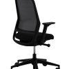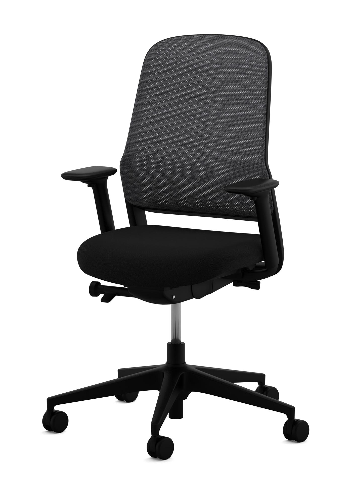 Rugframe in zwart gekleurd polyamide met netbespannen rugleuning van 80% gerecycled post-consumer polyester en 20% elastomeer, stof 34 Vivid, kleur 1401 zwartgrijs . Zitschaal en rugframe van zwart gekleurd polyamide.