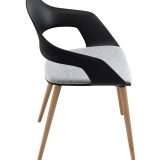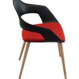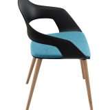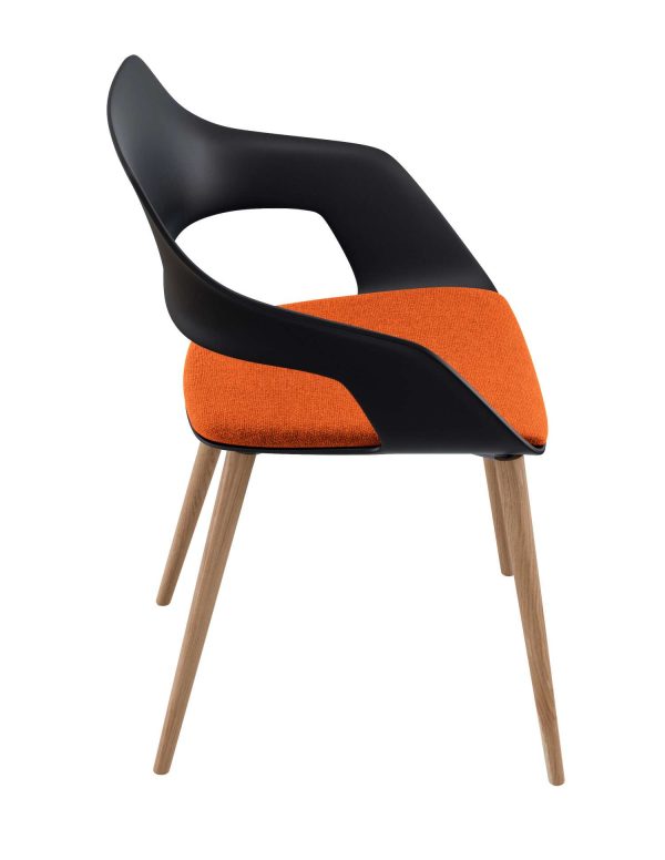 Specificaties Onderstel 4-poots, natuurlijk geolied massief eiken (niet stapelbaar). Zwarte, polypropyleen zitschaal met beklede zitting in zeven kleuren stof Camira Racer. Andere uitvoeringen leverbaar op aanvraag.